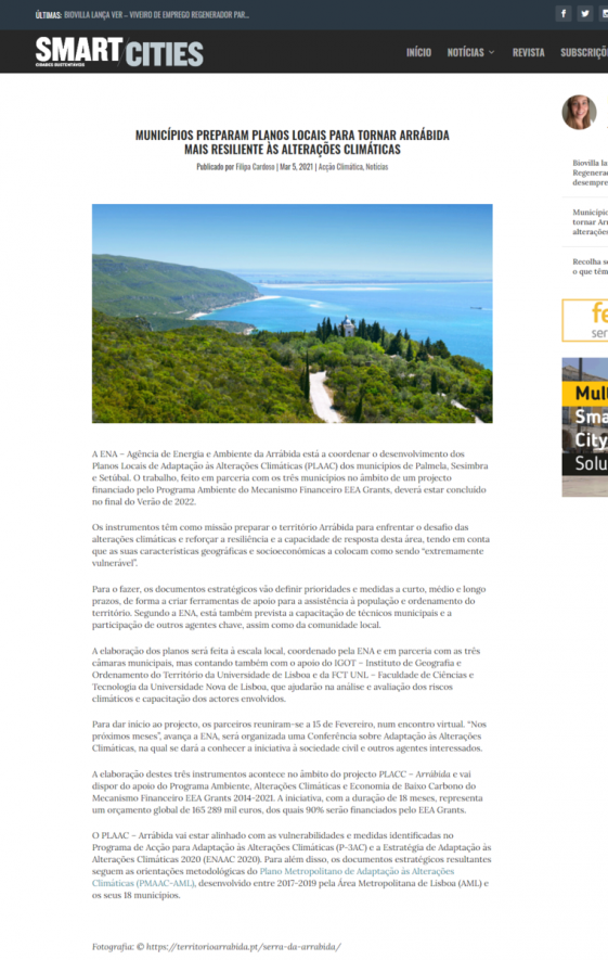 A ENA – Agência de Energia e Ambiente da Arrábida está a coordenar o desenvolvimento dos Planos Locais de Adaptação às Alterações Climáticas (PLAAC) dos municípios de Palmela, Sesimbra e Setúbal. O trabalho, feito em parceria com os três municípios no âmbito de um projecto financiado pelo Programa Ambiente do Mecanismo Financeiro EEA Grants, deverá estar concluído no final do Verão de 2022.