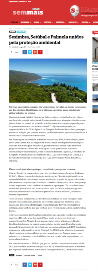 Os municípios de Setúbal, Sesimbra e Palmela vão ter, individualmente, planos que lhes irão permitir enfrentar de forma mais eficaz as alterações climáticas que já interferem ou podem vir a interferir no bem estar das respetivas populações e na preservação do seu património natural. O objetivo deste projeto, da responsabilidade da ENA – Agência de Energia e Ambiente da Arrábida, passa por encontrar solução que possam minorar problemas como a precipitação violenta, a erosão, ou as temperaturas excessivas.