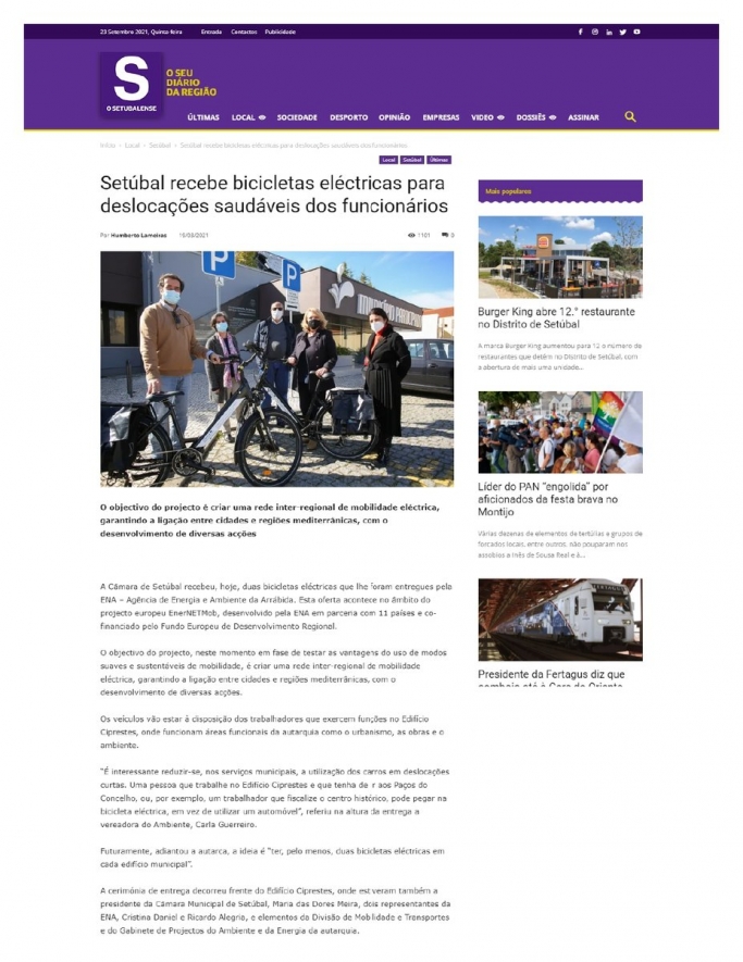 A Câmara de Setúbal recebeu, hoje, duas bicicletas eléctricas que lhe foram entregues pela ENA – Agência de Energia e Ambiente da Arrábida. Esta oferta acontece no âmbito do projecto europeu EnerNETMob, desenvolvido pela ENA em parceria com 11 países e co-financiado pelo Fundo Europeu de Desenvolvimento Regional.