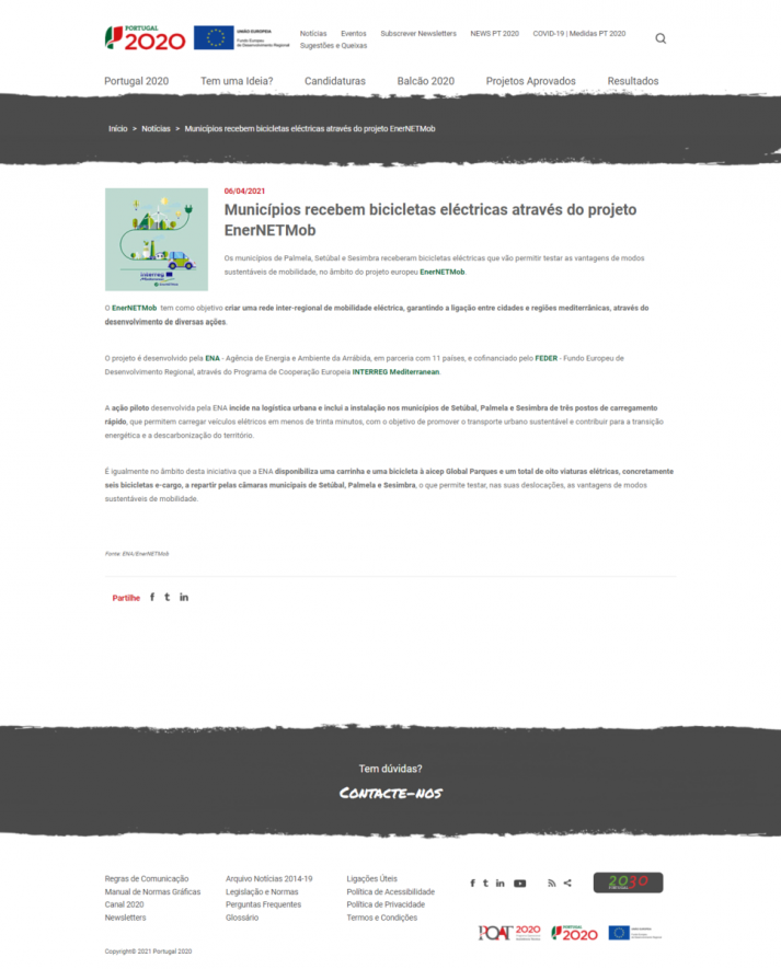 É igualmente no âmbito desta iniciativa que a ENA disponibiliza uma carrinha e uma bicicleta à aicep Global Parques e um total de oito viaturas elétricas, concretamente seis bicicletas e-cargo, a repartir pelas câmaras municipais de Setúbal, Palmela e Sesimbra, o que permite testar, nas suas deslocações, as vantagens de modos sustentáveis de mobilidade.