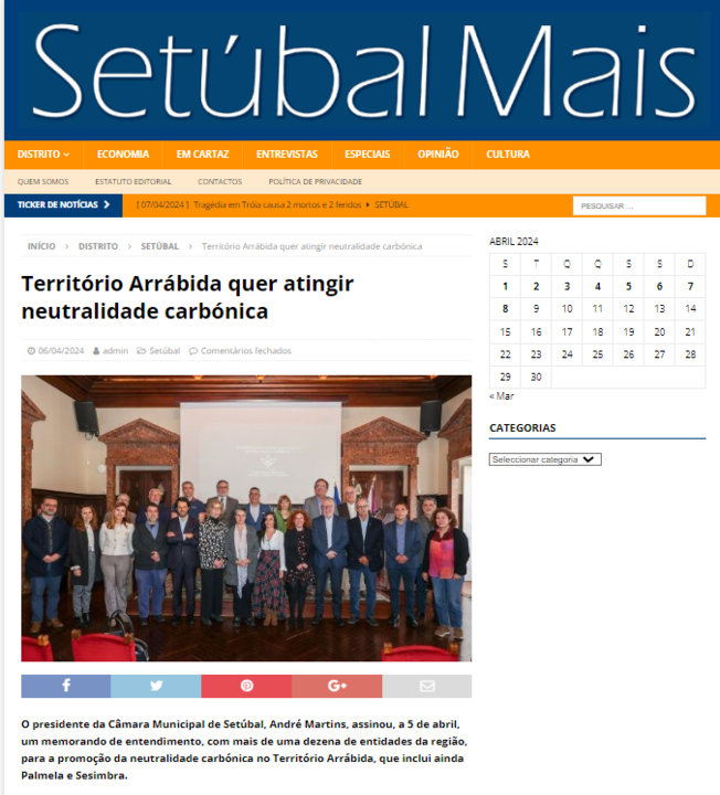 Setúbal Mais. O presidente da Câmara Municipal de Setúbal, André Martins, assinou, a 5 de abril, um memorando de entendimento, com mais de uma dezena de entidades da região, para a promoção da neutralidade carbónica no Território Arrábida, que inclui ainda Palmela e Sesimbra.