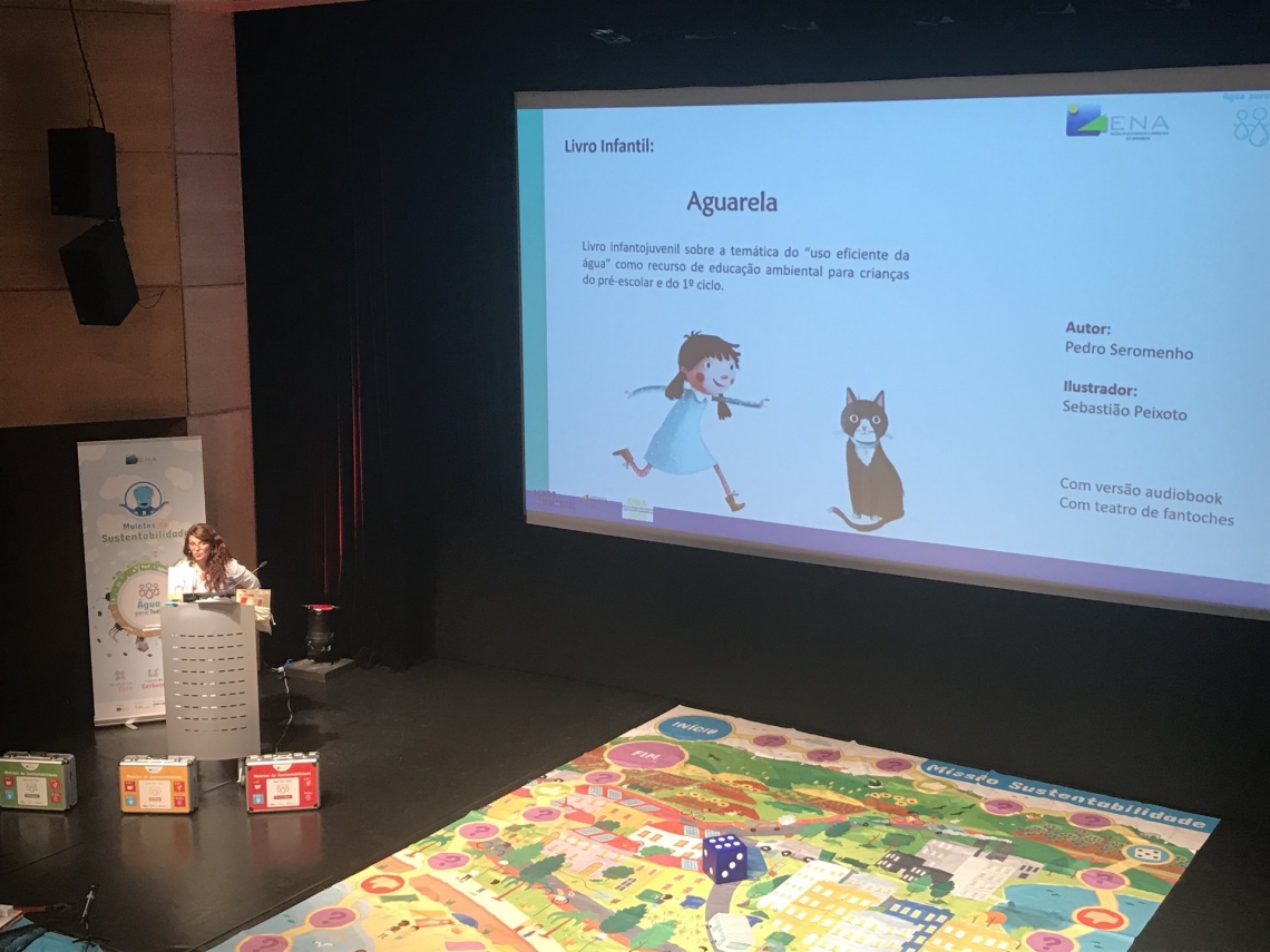 Outro dos materiais educativos apresentados foi “Aguarela”, um livro infantil que fala sobre a importância de poupar água, através da história de uma menina muito esquecida, que gasta muita água no seu dia-a-dia. Ela adora pintar e a sua cor favorita é o azul. Mas um dia descobre que o céu e o mar perderam a cor… O texto é da responsabilidade do autor Pedro Seromenho e a ilustração do ilustrador Sebastião Peixoto. Acompanha o livro um teatro de fantoches com as personagens da história, que permite às crianças a recriação deste conto, bem como a criação de novas histórias ligadas ao tema “uso consciente da água”. Durante o evento, os alunos da EB1/JI de Sesimbra foram os responsáveis pela realização deste espetáculo de fantoches.