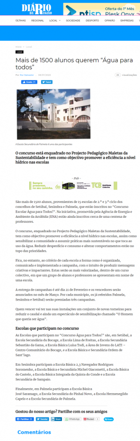 São mais de 1500 alunos, provenientes de 15 escolas de 2.º e 3.º ciclo dos concelhos de Setúbal, Sesimbra e Palmela, que estão inscritos no “Concurso Escolar Água para Todos!”. Na iniciativa, promovida pela Agência de Energia e Ambiente da Arrábida (ENA) estão ainda inscritos cerca de uma centena de professores.